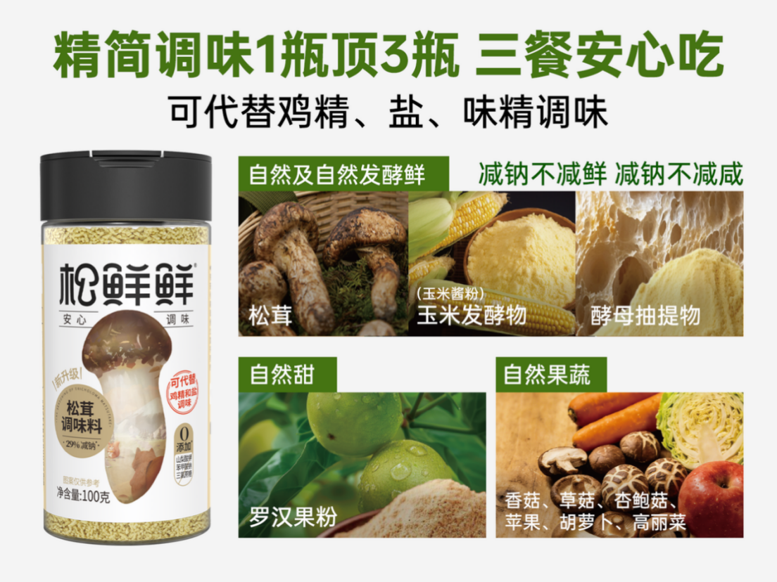 要想从根本上解决“钠超标”,除了调整烹饪习惯,更需要提供能够替代传统高钠调味品的解决方案——即在降低钠含量的同时,通过其他技术手段补偿风味损失,实现“减钠不减鲜”。近年来,以“松鲜鲜”为代表的健康国货调味品品牌,正是这一技术路线的典型代表。